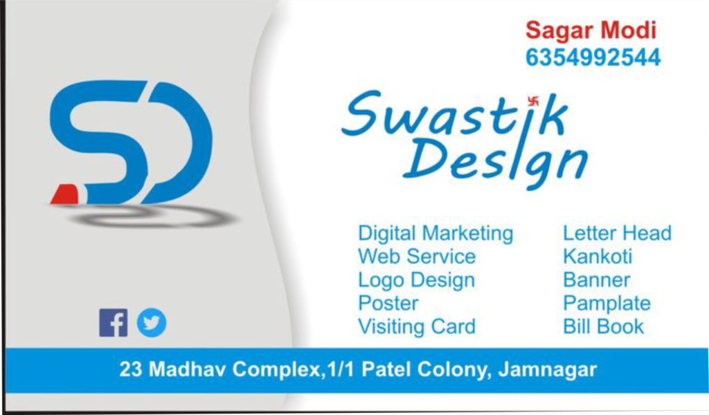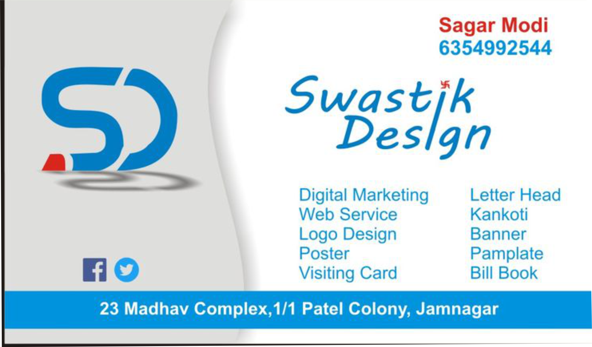 Looking for high-quality business cards in Jamnagar? Swastik Design , we create custom business card designs that make a lasting impression. Whether you need premium, modern, or creative business cards, we offer affordable and professional solutions tailored to your brand. Our designs are unique, eye-catching, and print-ready, ensuring your contact details stand out. Get your business card designed today and leave a memorable mark on your clients! Contact us now for fast and reliable business card design services in Jamnagar.